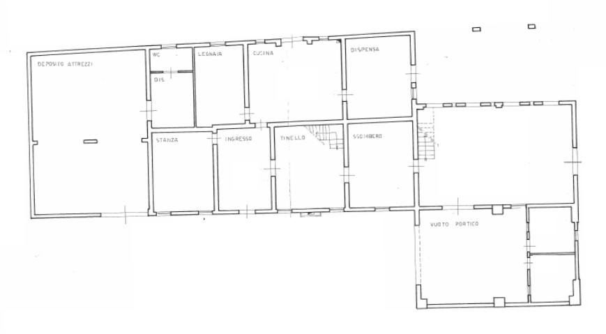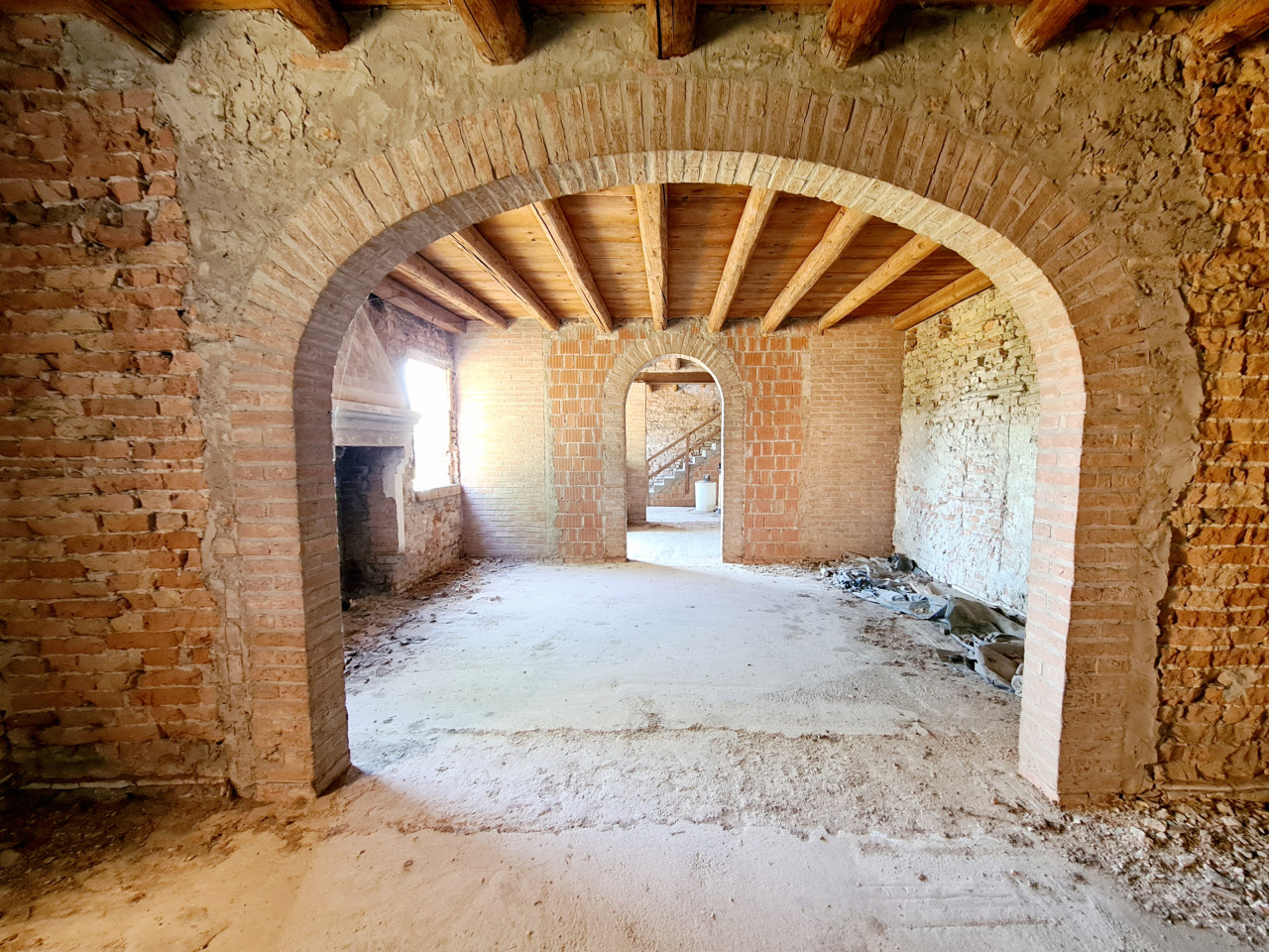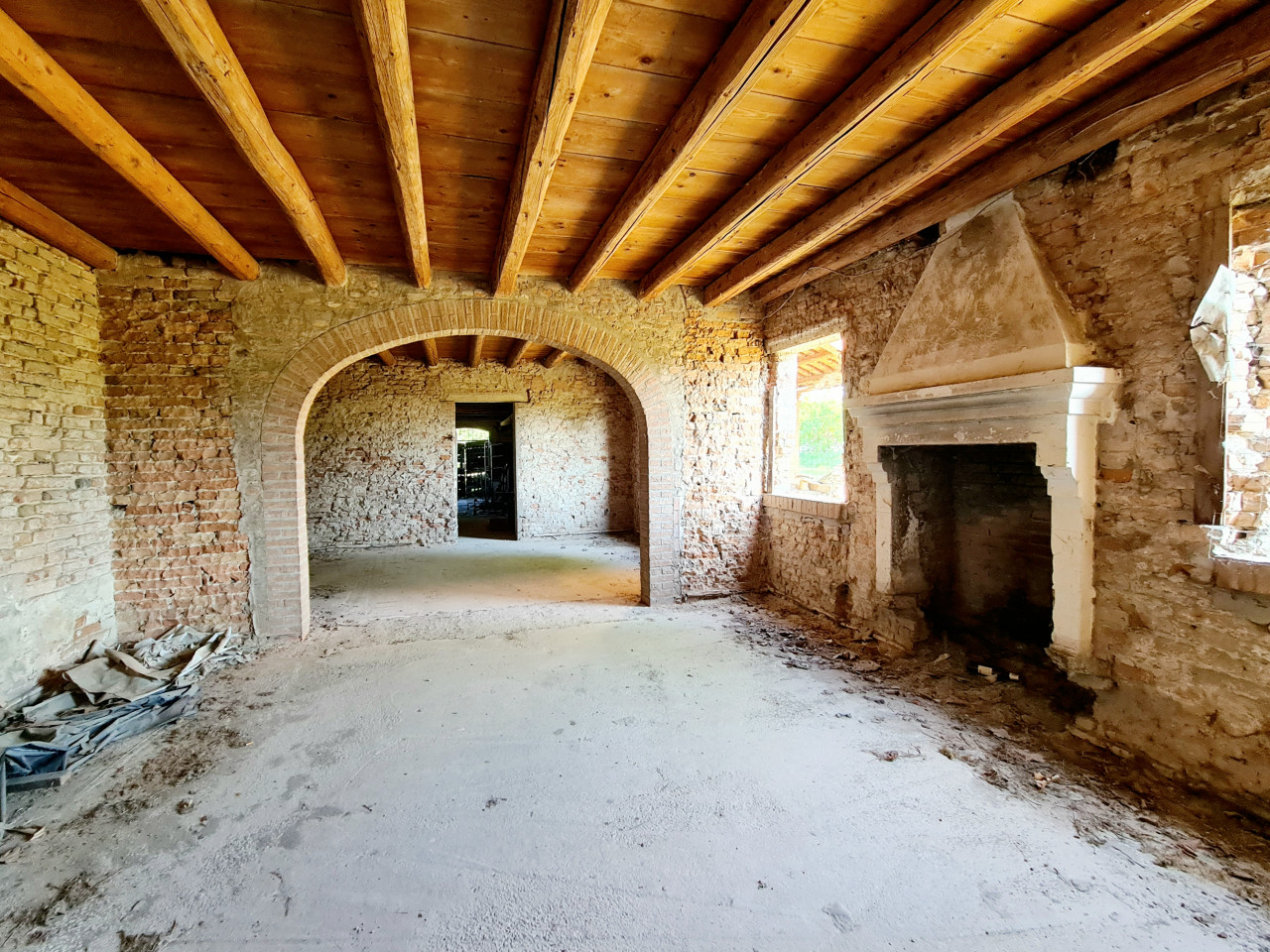 L'abitazione, ancora al grezzo, è caratterizzata al piano terra da: ampia zona giorno, con ingresso, cucina, salotto, dispensa, tinello, bagno e altri locali di sgombero. Al piano primo si sviluppa la zona notte con tre camere matrimoniali, una singola e varie stanze adibite a ripostiglio e soffitta. A servizio dell'immobile una barchessa con stalla, porticato e un grande magazzino.